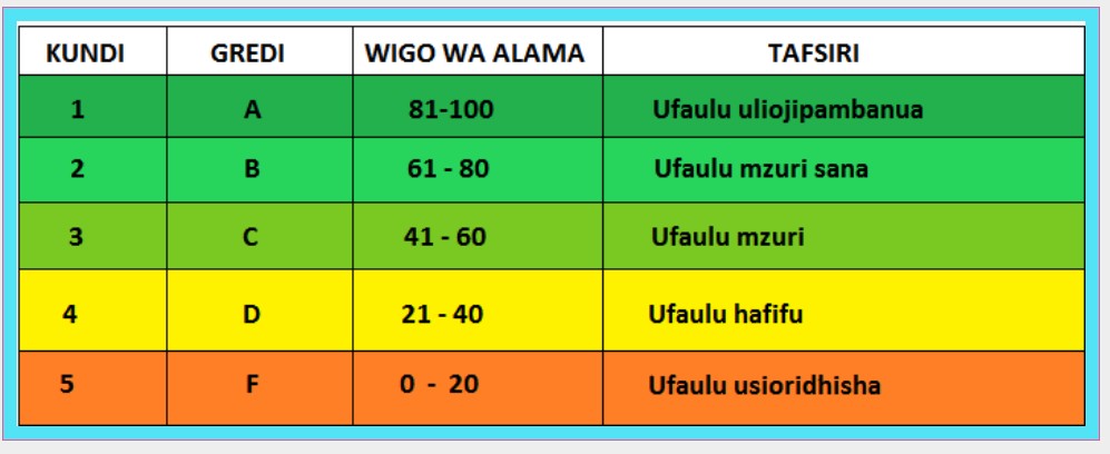 Kila somo hupimwa kwa alama kuanzia 0 hadi 100 na kugawanywa kama ifuatavyo: