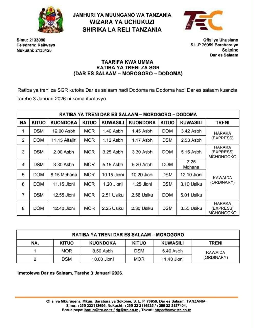 Ratiba inaweza kubadilika kulingana na matengenezo au maelekezo ya TRC